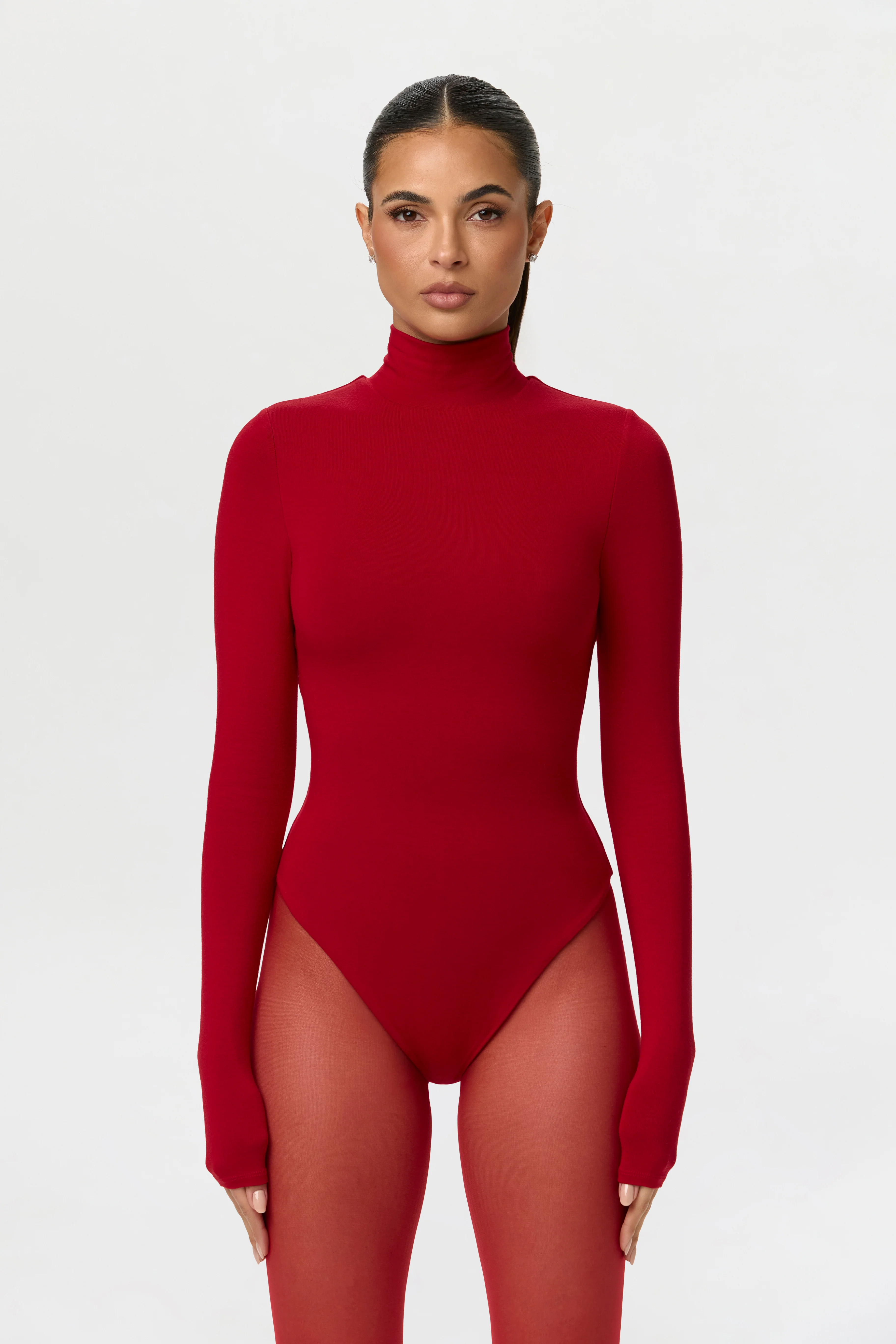 Our body contouring bodysuit features a turtleneck design and long fitted sleeves. It's shapewear-inspired to suck you in and create shape. Finishing details include a thong cut in the back and snap closures down below. Back zipper closure makes it simple to put on with ease.