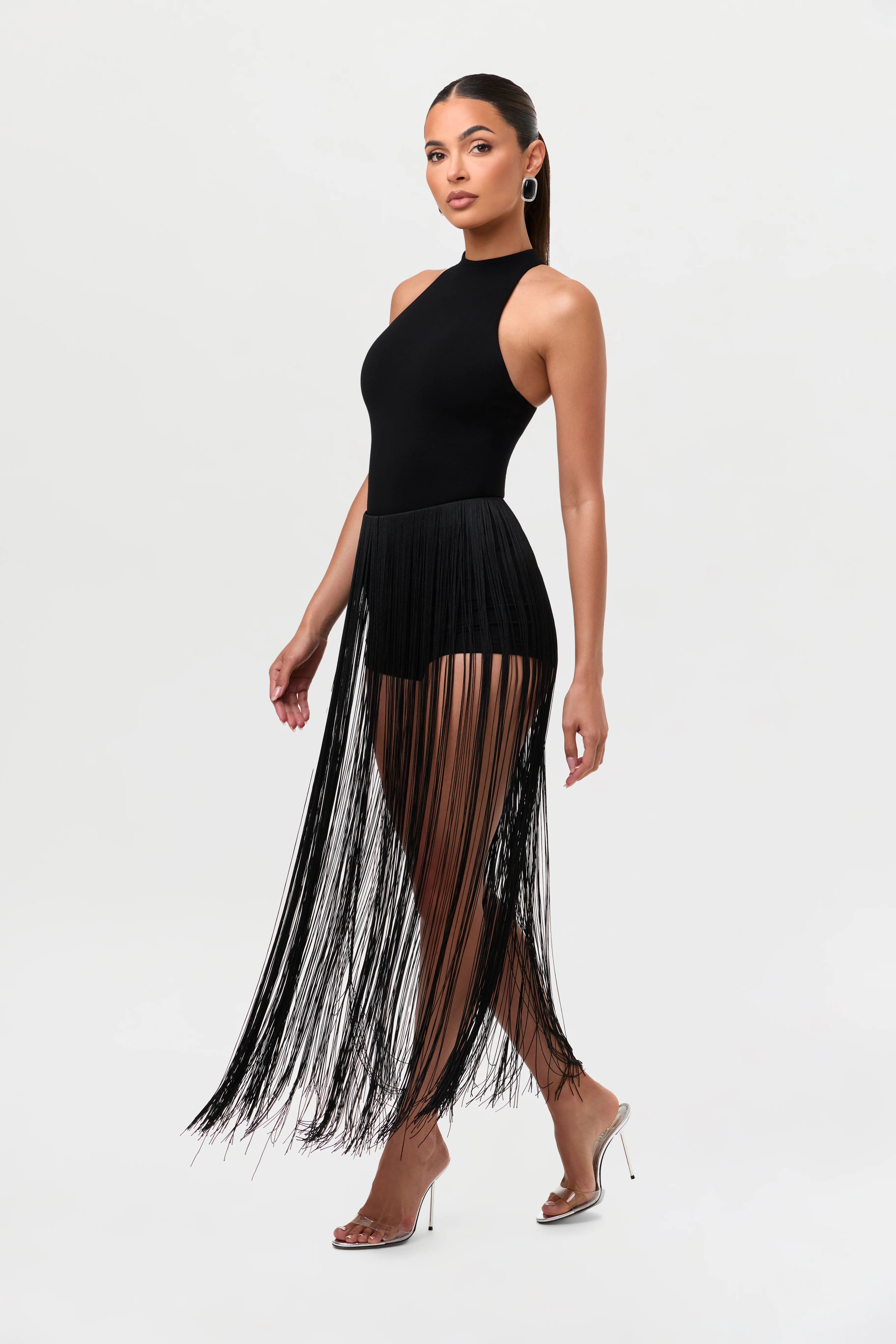 Designed to contour and sculpt. Ready to move with your every step. Our playful summer fringe shorts is crafted with a high waist and shapewear-inspired fabrication that sucks you in in all the right places. Long fringe detail adds a pep to every step. Style with our Butter Racerback Contour Bodysuit and your favorite heels.