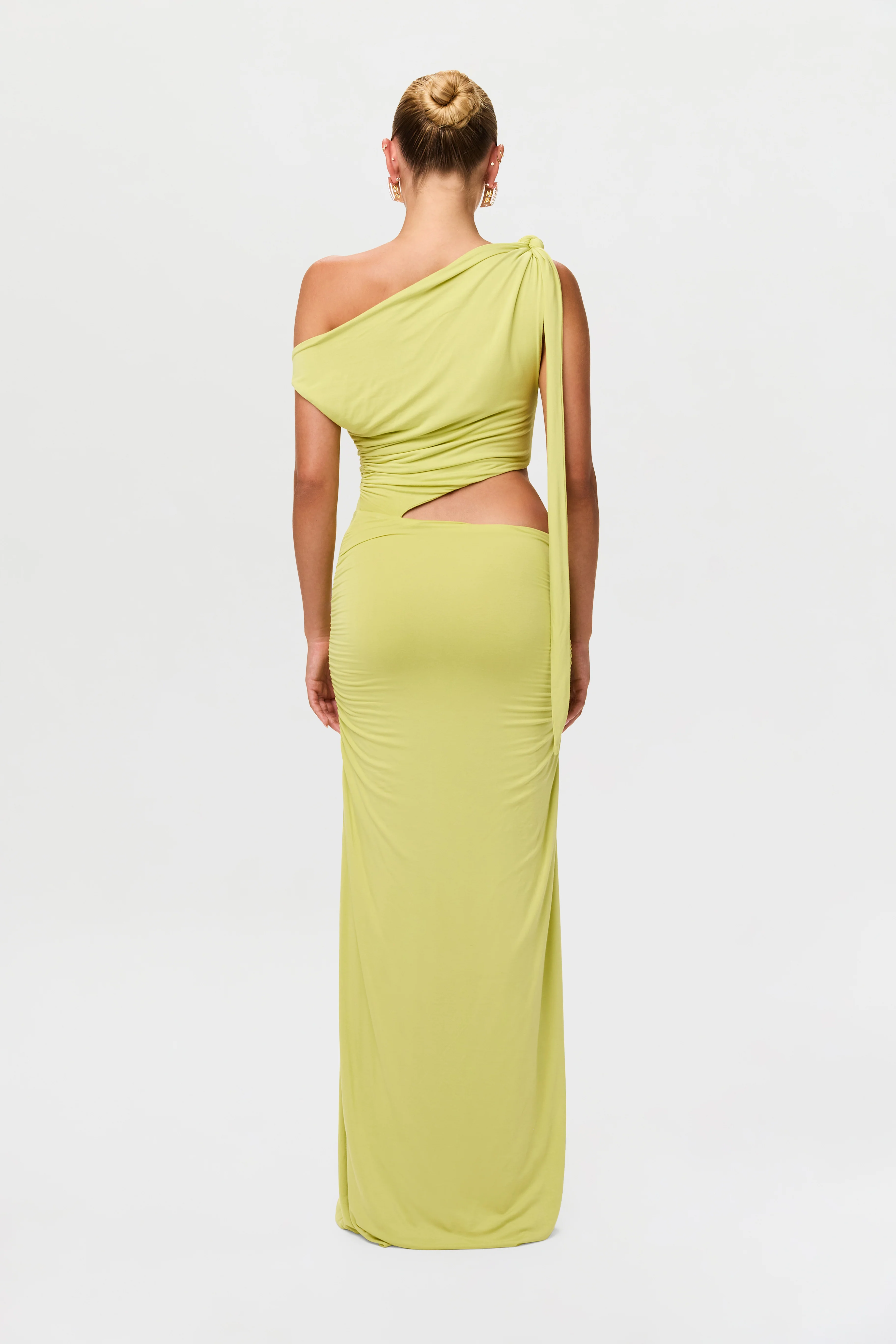 This head-turning maxi dress is formulated with an off-shoulder design and a one-shoulder knotted draped tie detail. Cutout design and v-waist accentuates the body with ruched gathering and drape detail. A go-to dress for city night plans, and island getaways.
