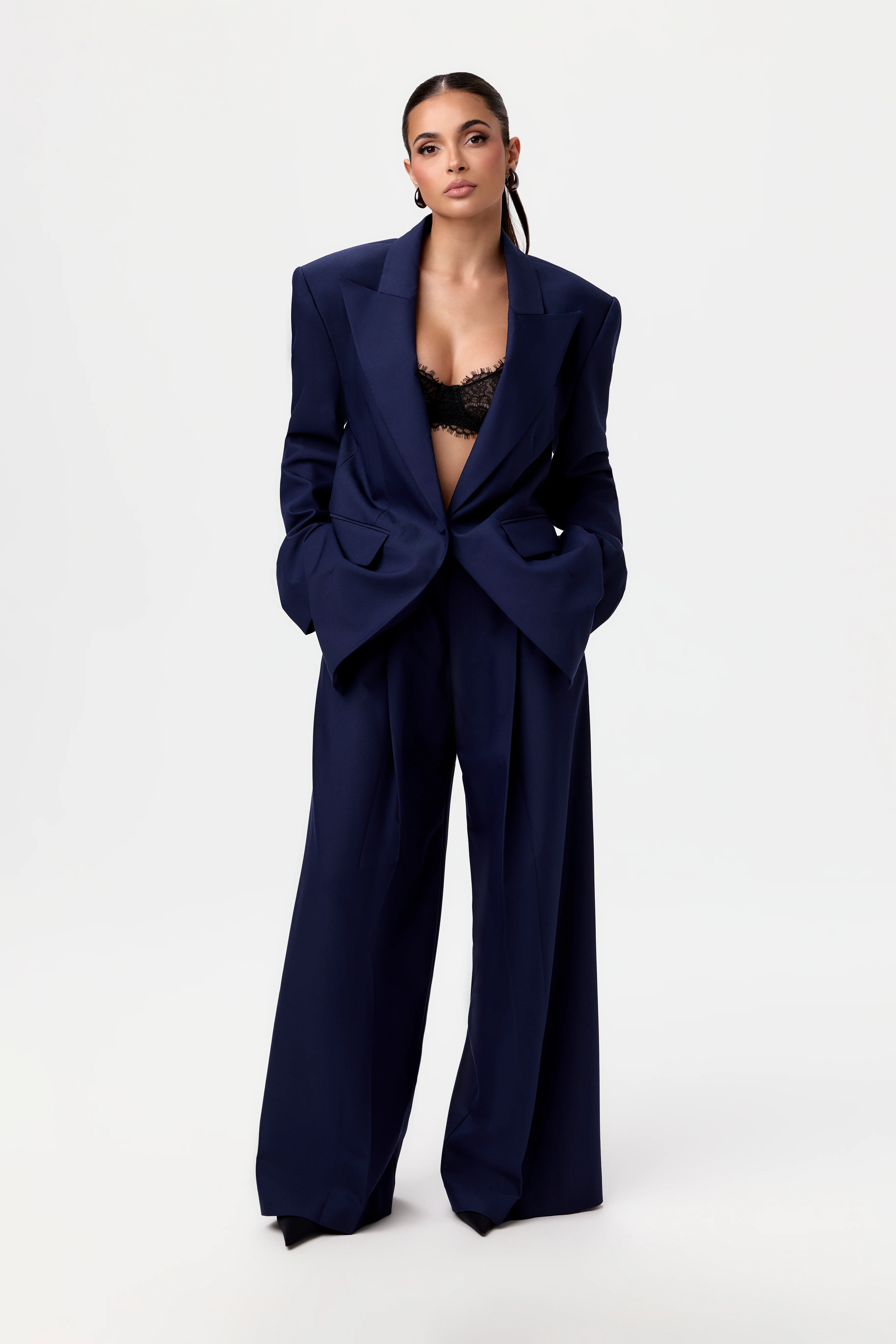 Bosswear for everywhere. Our wide-leg suit pant is designed with high waist, belt loops, slant pockets, pleated detail, back pockets, front zipper, single button with hook and eye closures. Style with our matching boyfriend blazer to put the power in empowerment.