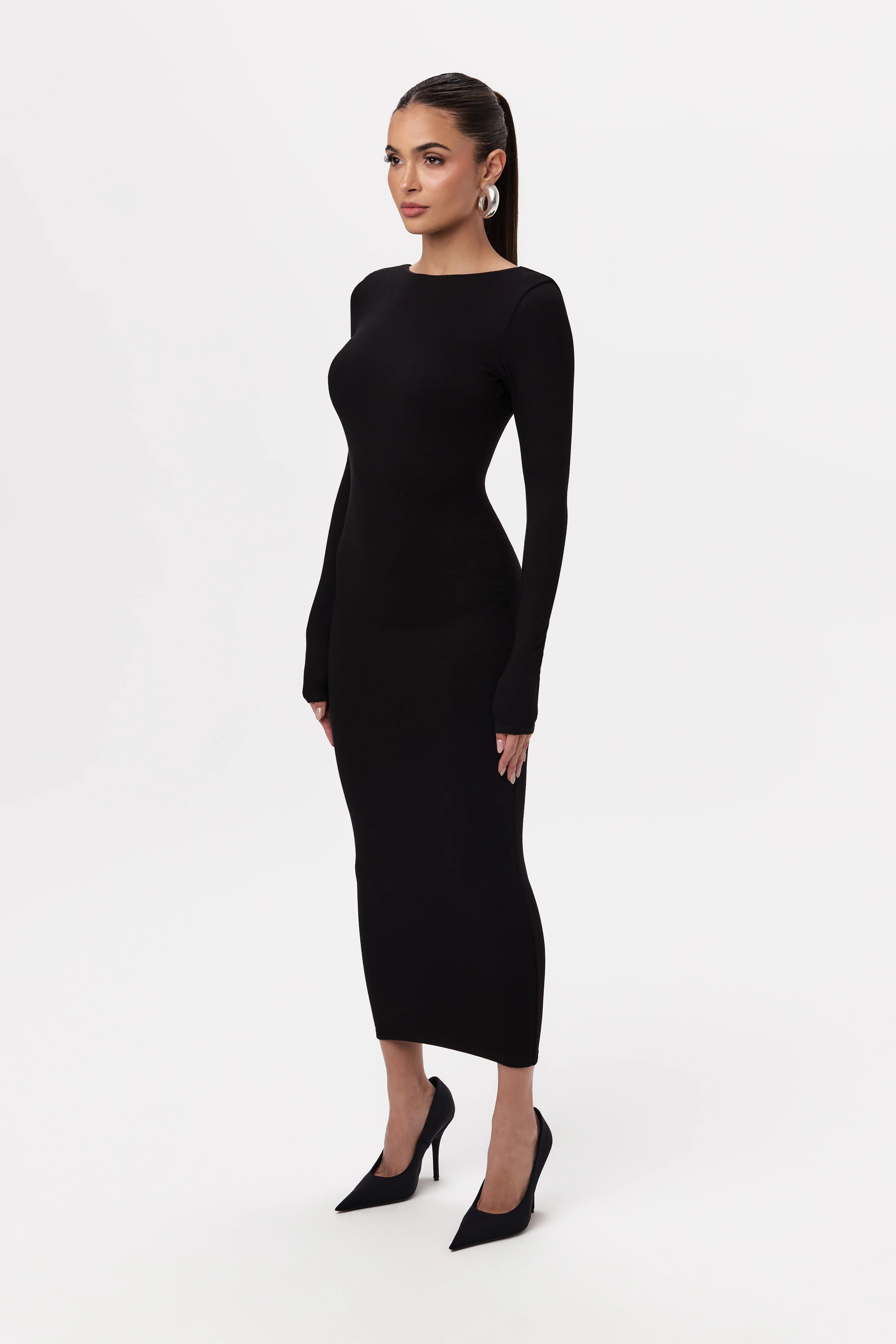 Our body-con midi dress is an NW staple with its fitted long sleeves and boat neckline. Scooped cut in the back to add drama to the sophistication. Show off your hourglass figure with your fave heels, and own it when you make your entrance!
