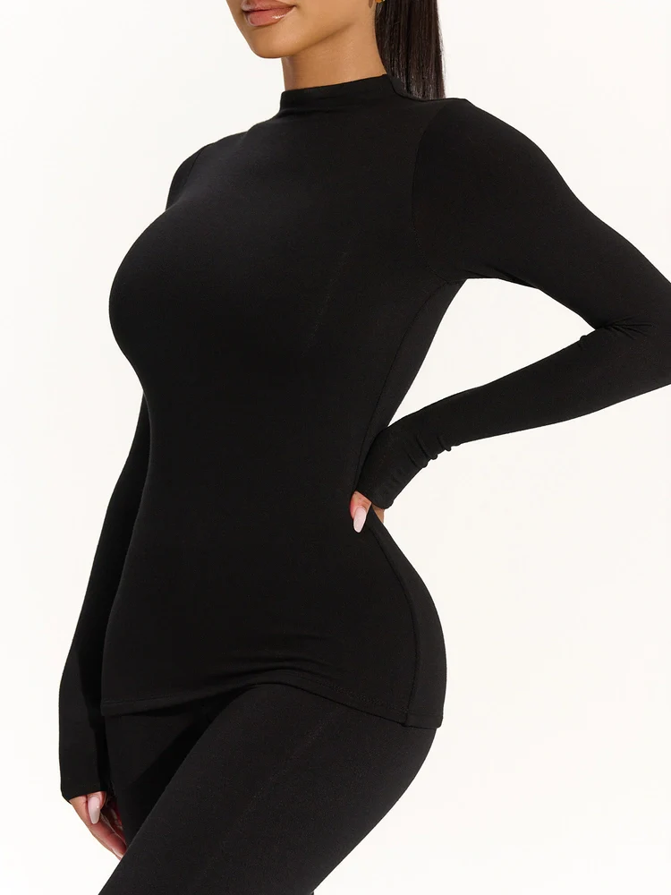 Our basic bodycon top is so effortless and serves comfort and versatility. Features a mock neckline, long fitted sleeves and form fitting finish. Style with our matching bottoms and more to complete the look. Perfect go-to for day or night! Xo