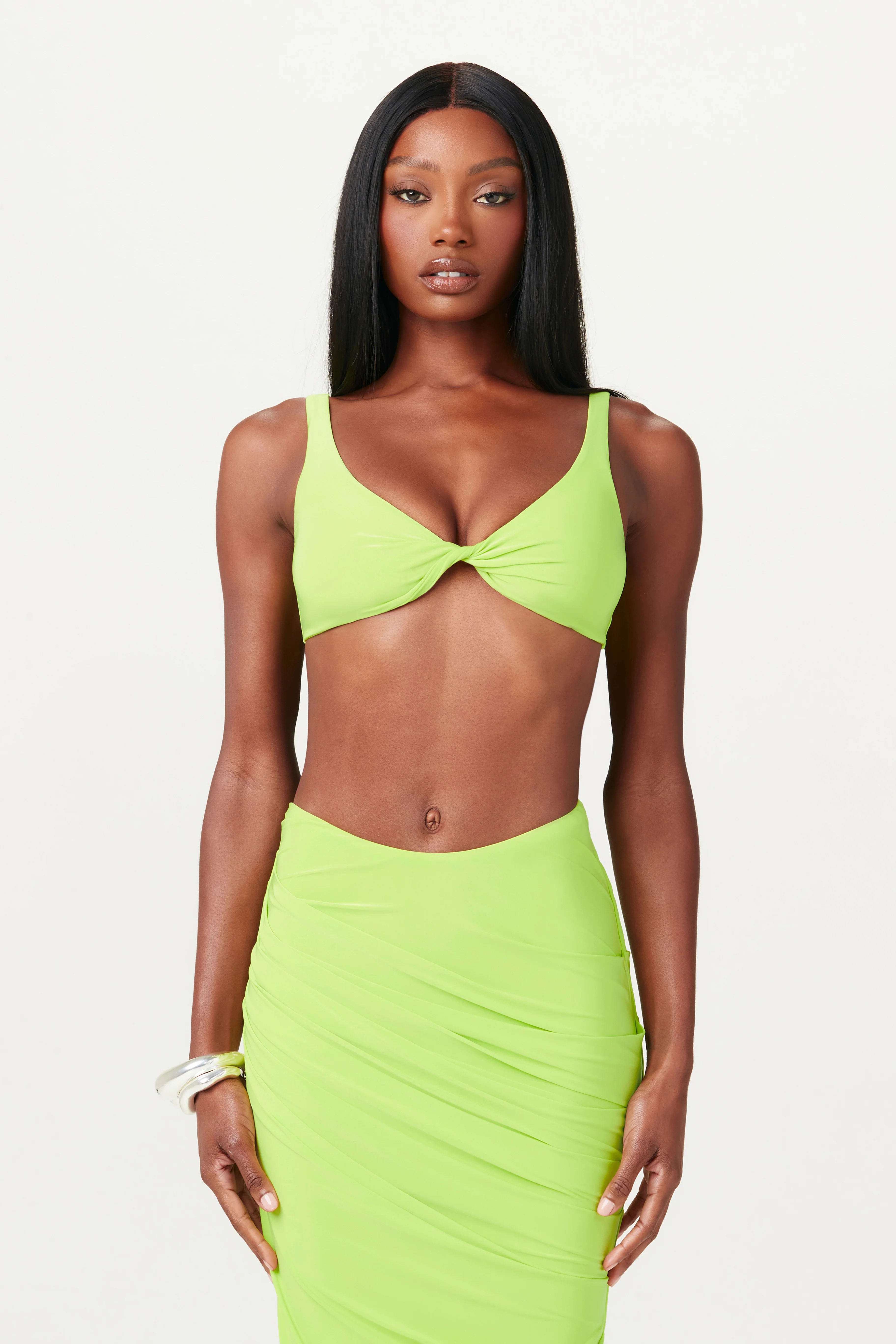 Our summer-ready tank crop top in lime green is crafted with a modern twist front and a triangle-like design that is beyond comfortable on the skin. Amplify the effect with our sculptural coord maxi skirt.